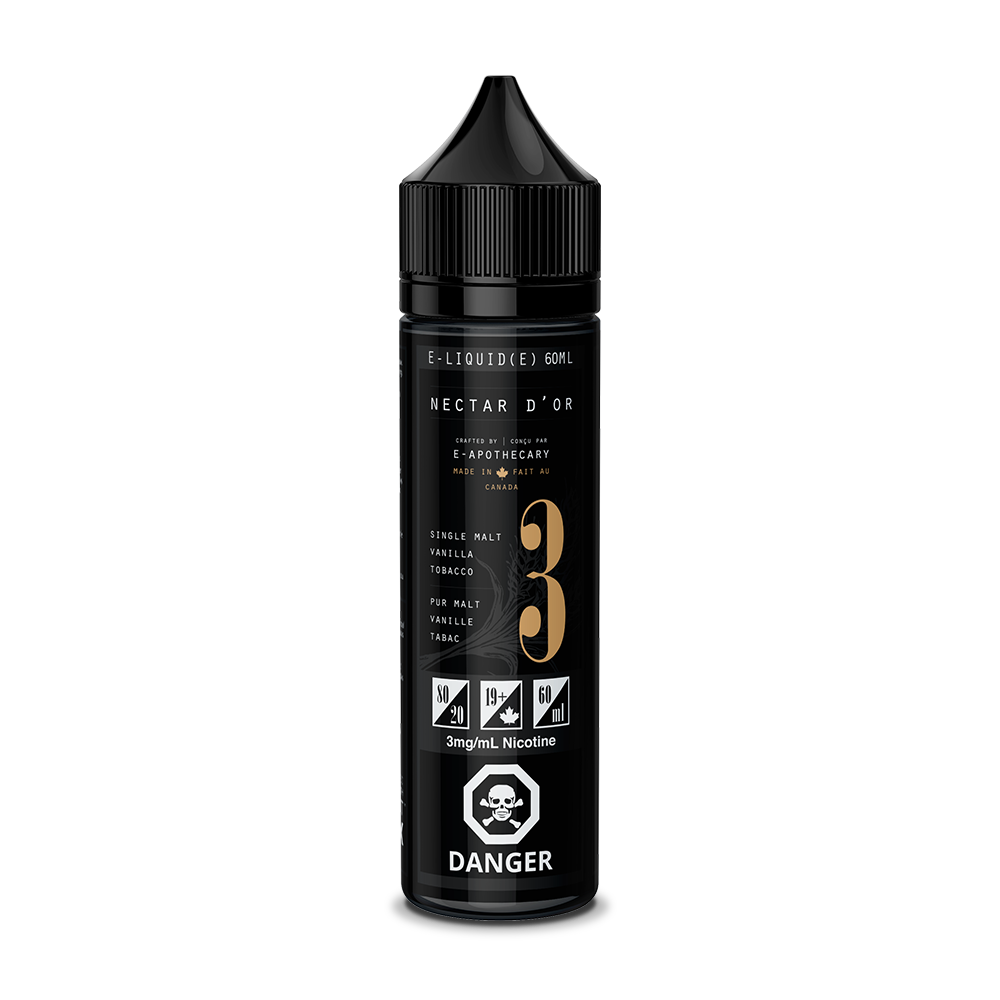 The e-Apothecary signature flavour, Nectar D’Or is now available in a High VG, sub ohm compatible ratio! Nectar D’Or features creamy butterscotch custard, roasted hazelnuts, RY4 and hints of single-malt whiskey. Made with the patented Salt NIX™ nicotine formula, this e-liquid features wonderfully complex layers of richness.